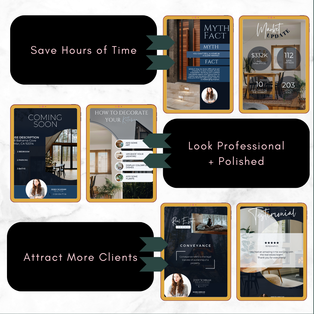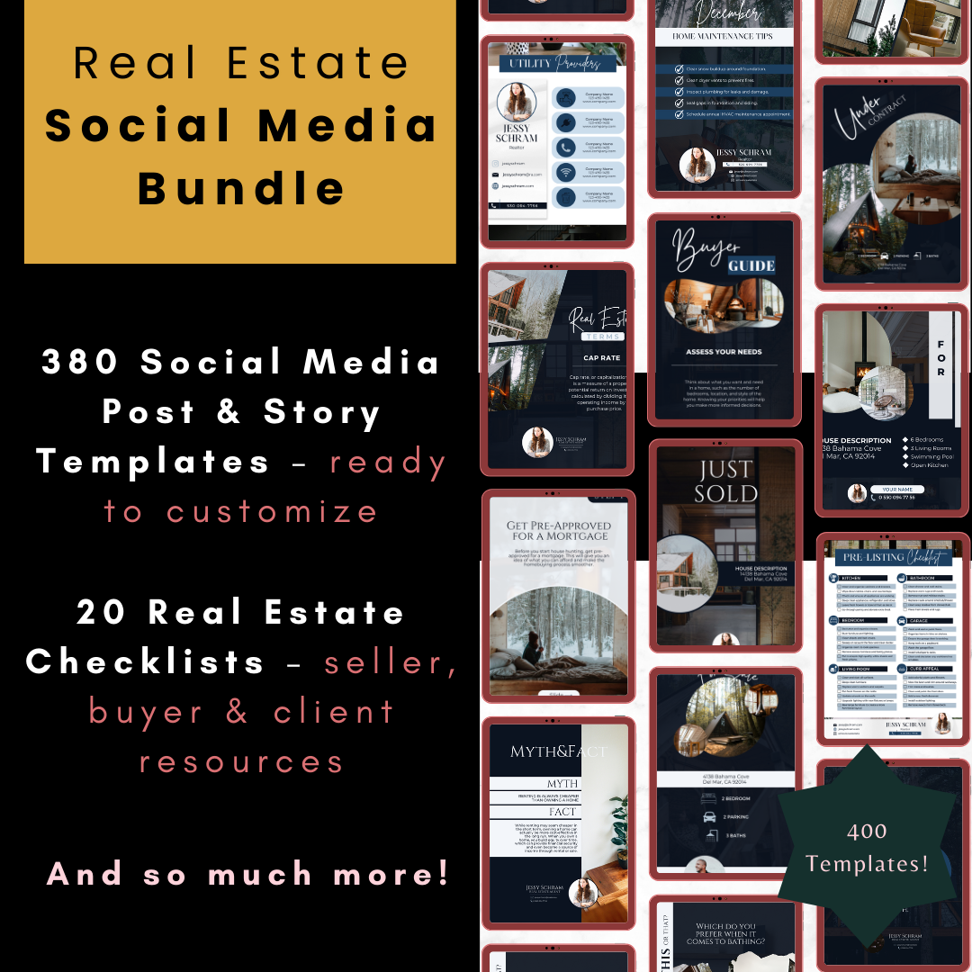 - Templates include: For Sale, Coming Soon, Open House, Just Listed/Sold, Under Contract, Testimonials, Real Estate Terms. Seller/Buyer Guide, Market Updates, and so much more!